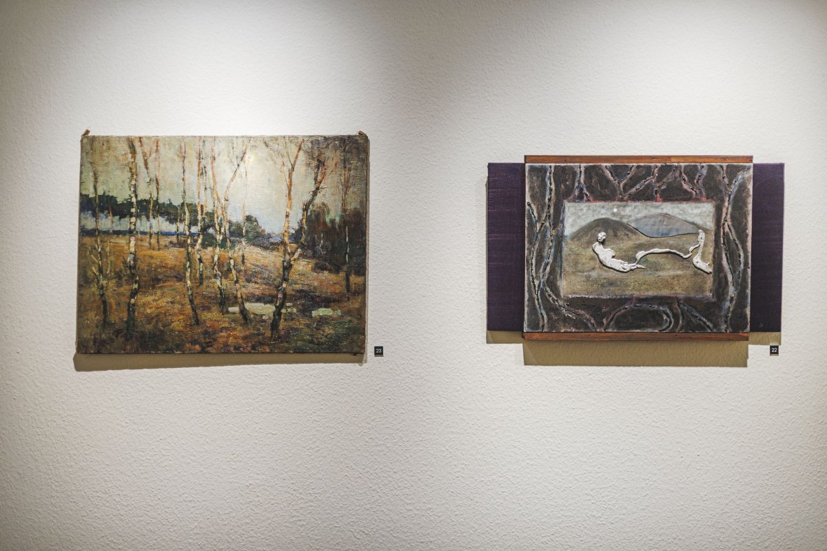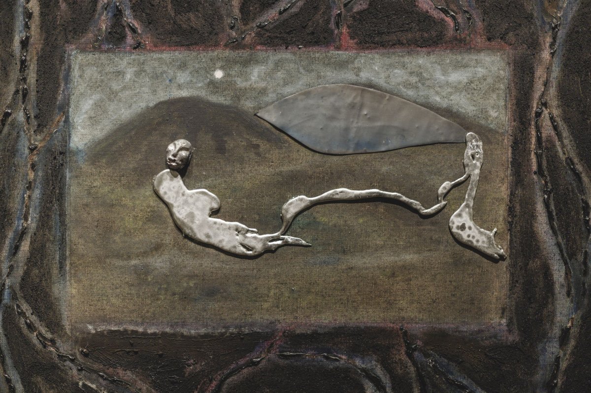 Eddib also contributed the oil painting Fluisteringen (Whispers), which consists of oil, lead, tin and indigo cloth on canvas, with a partial wooden frame. This work depicts a haunted mining hill, an industrial landscape that Emile Van Doren refused to paint because it was his aim to document the fading beauty of "natural" landscapes that were rapidly changing in his time.