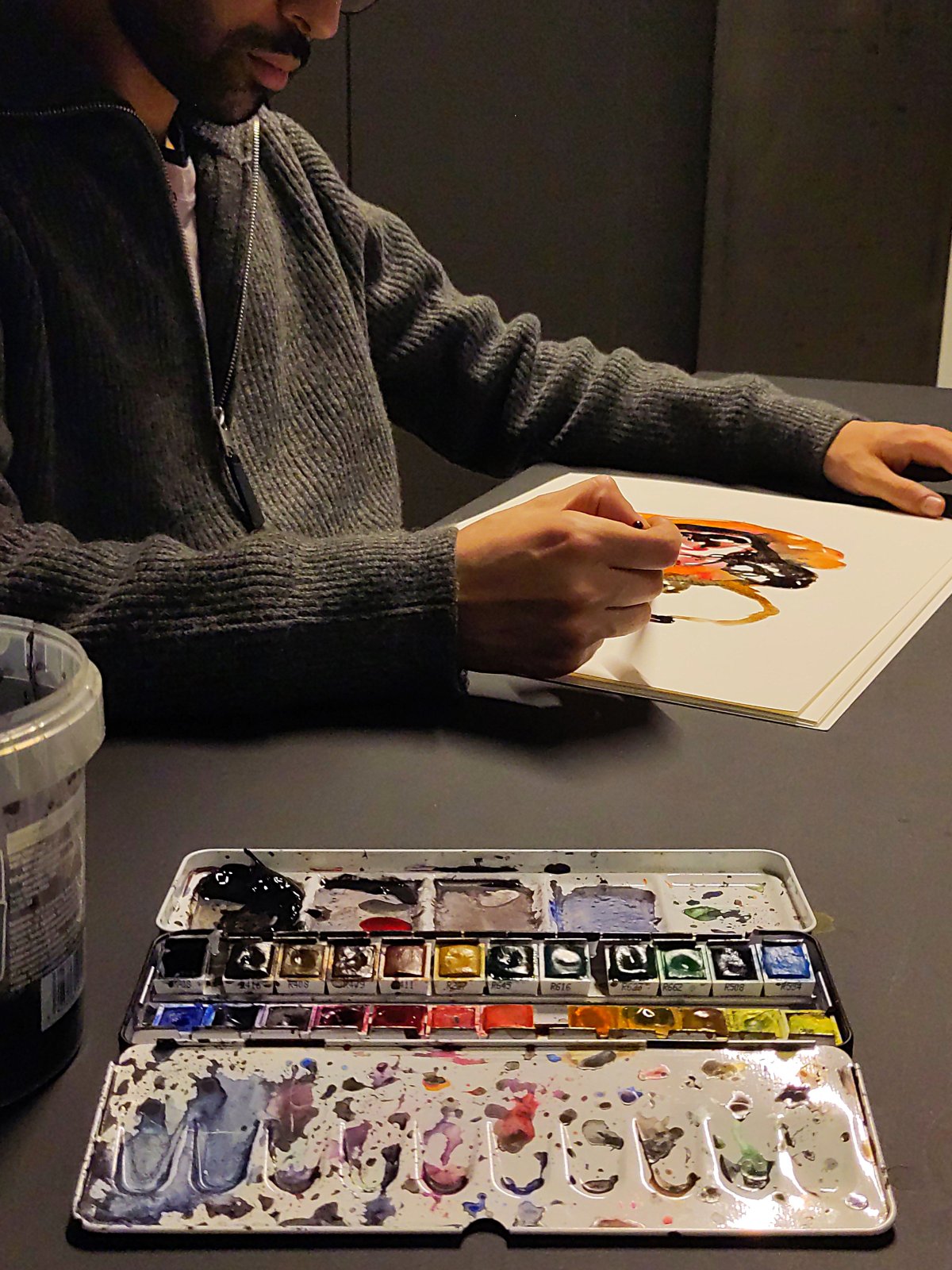 Mounir Eddib was invited to paint live illustrations during four panels of this yearly equality festival by Curieus. Caught on camera in the act of making, these watercolors on paper captured fleeting impressions of ongoing conversations.