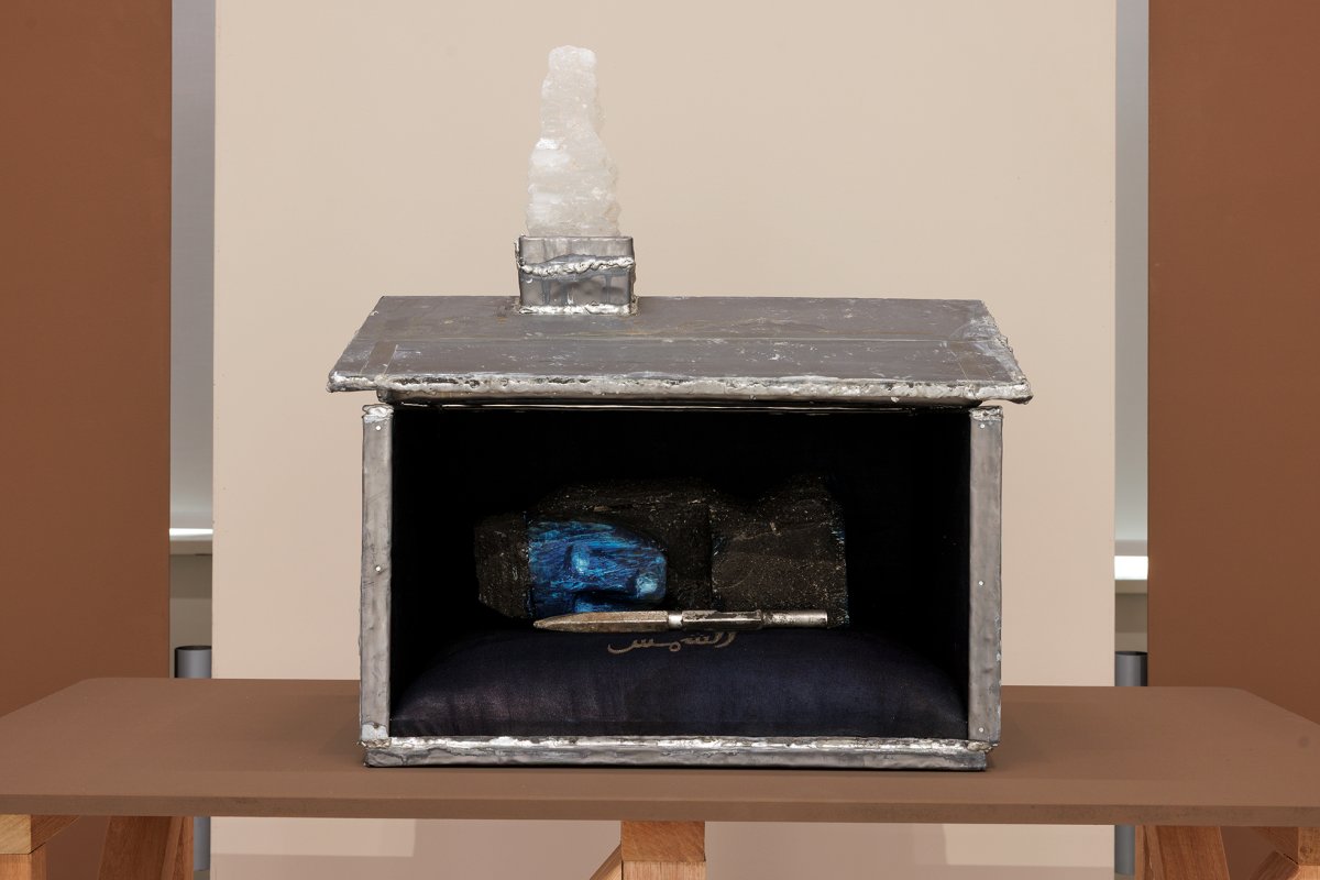 Mounir Eddib's contribution is titled Dar (2025). This house-like structure made of soldered lead sheets represents a ritualized Moroccan coal miner's home. Eddib's grandfather was seduced to come to the mines of Belgium as a "guest worker" in the 1970s. Although his hard labor laid the foundations for national wealth, migrant miners were treated as outsiders and inferior citizens. As their temporary residences became permanent homes, many were left with unresolved feelings of displacement. Nevertheless, by making use of North African folk rituals and traditionally protective substances such as lead, indigo cloth and alum saltstone, Sahrawiya women manifested domestic safe spaces for their families.