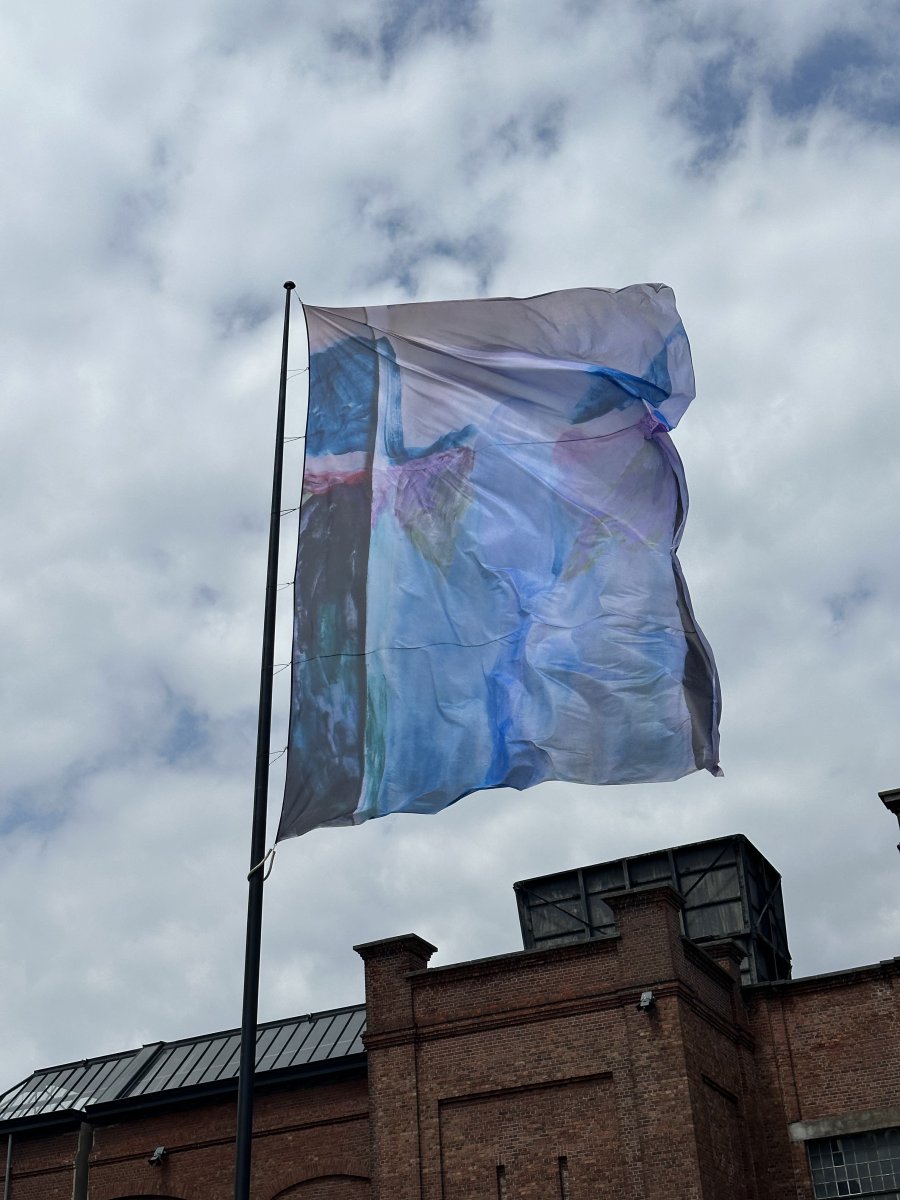 Largest flag (60m²) of the Benelux raised during the opening ceremony. Based on the oil painting Worried wings (2022) by Mounir Eddib. Produced in collaboration with 019 Ghent.